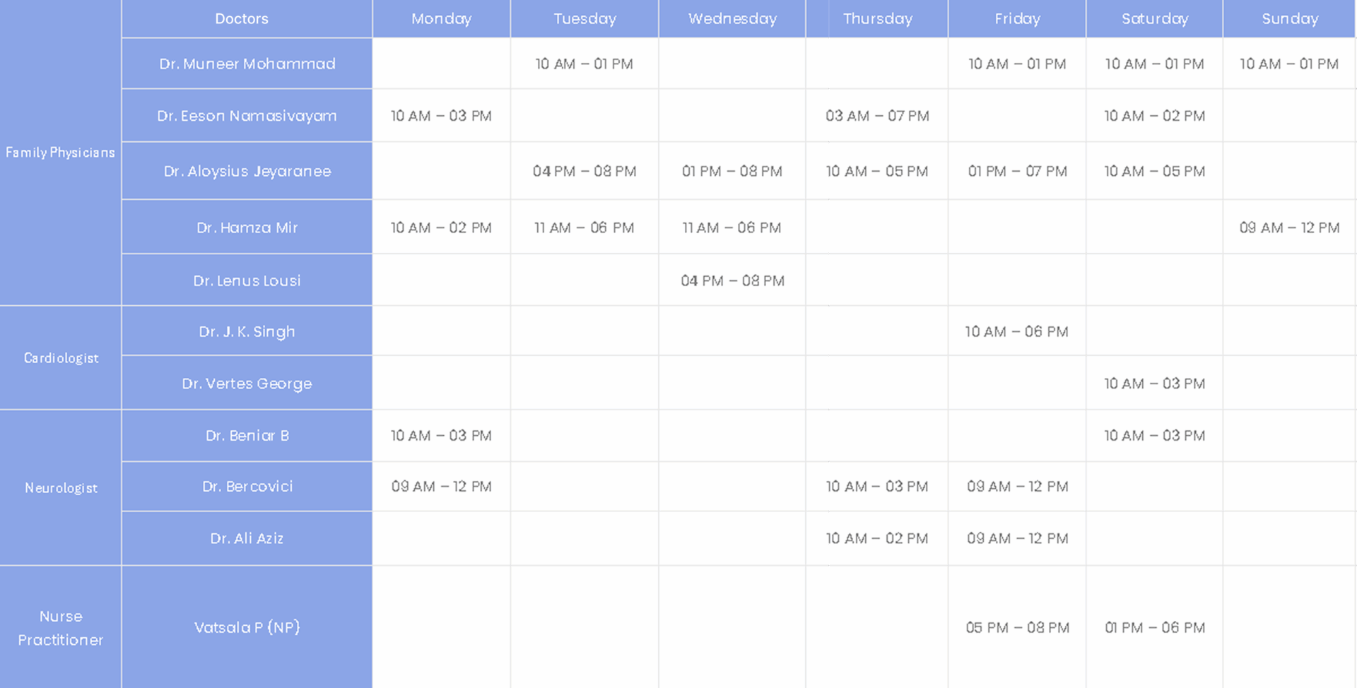 Family Physicians | Cardiologist | Neurologist | Nurse Practitioner | ||||||||